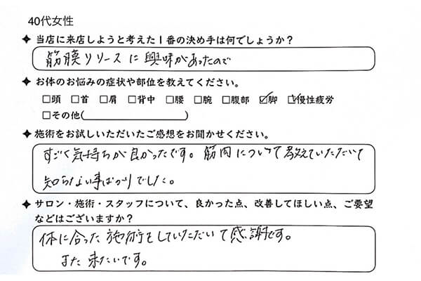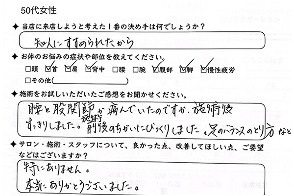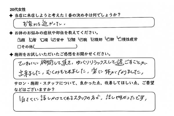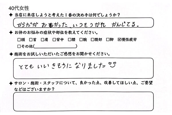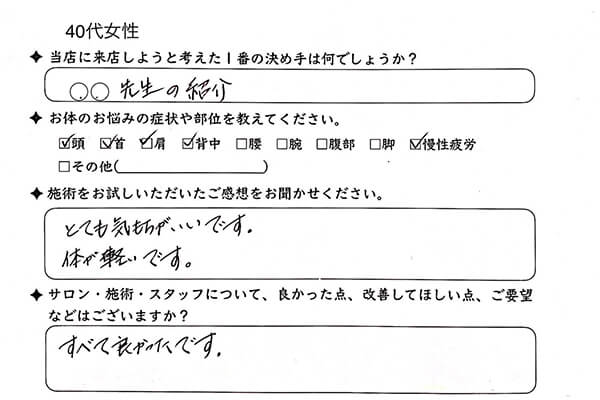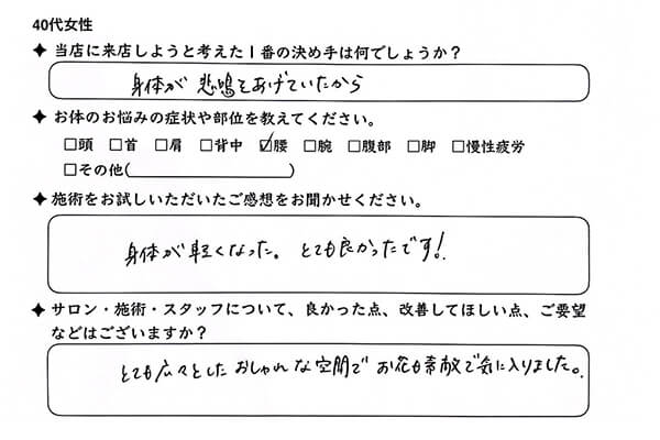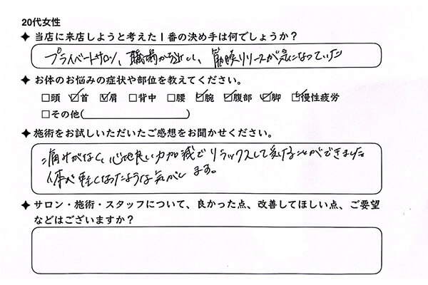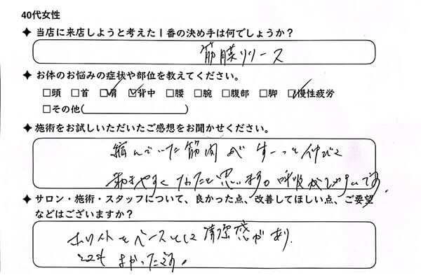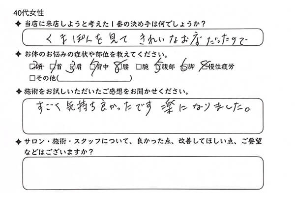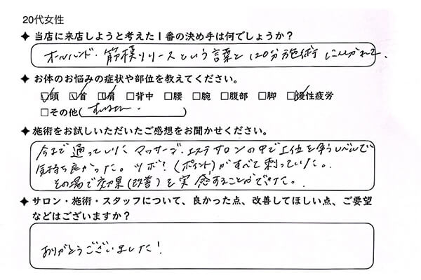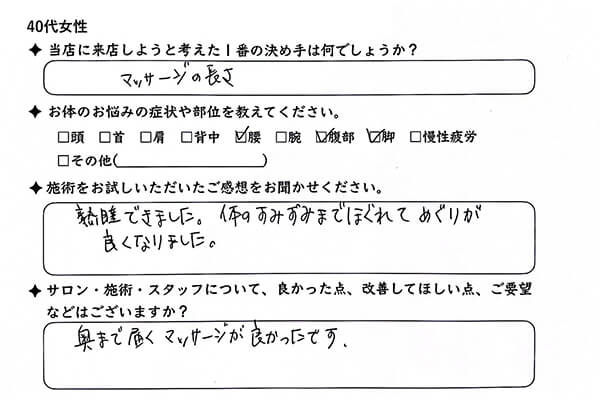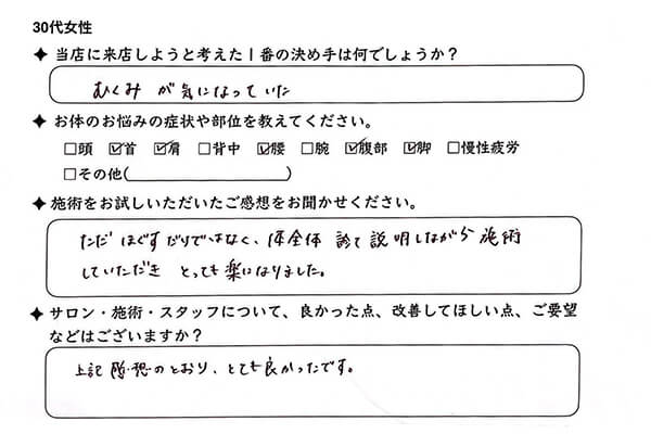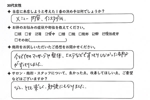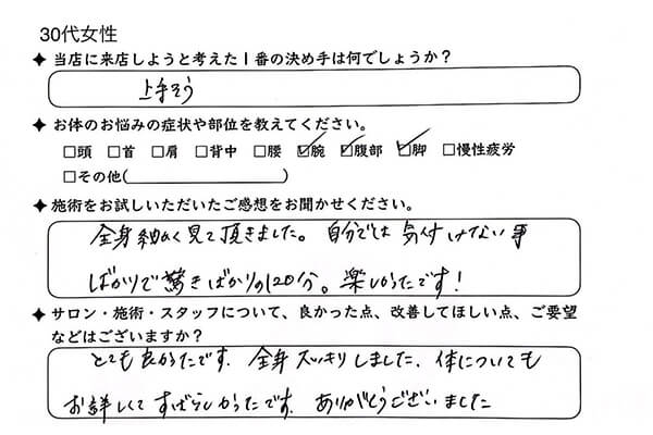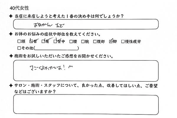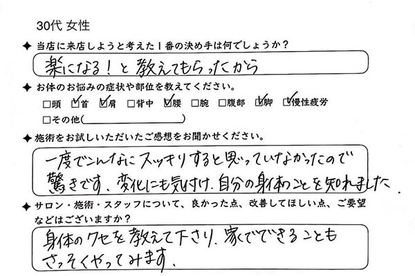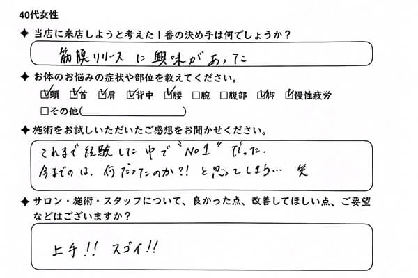 今まで受けたエステ・マッサージの中で一番最高でした。来てすぐの体と施術した後の体のライン、お肉の位置が別人のように変わっていてとても感動しました。