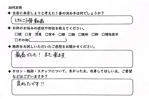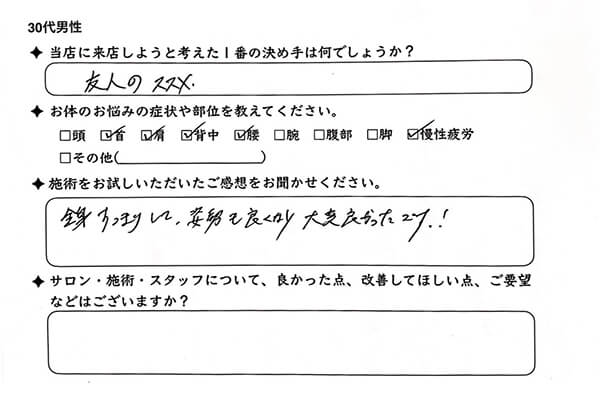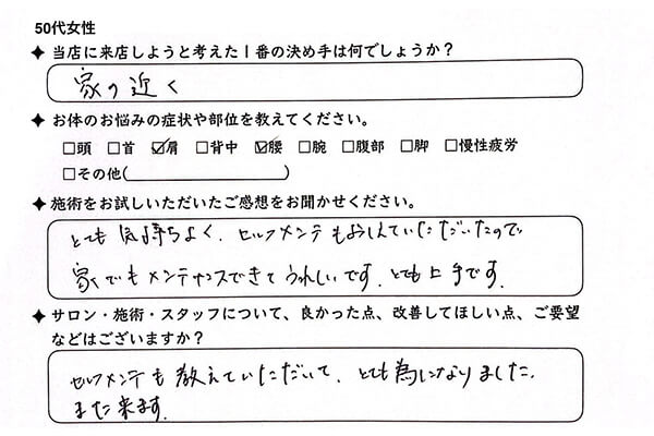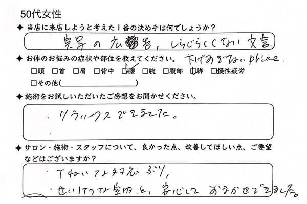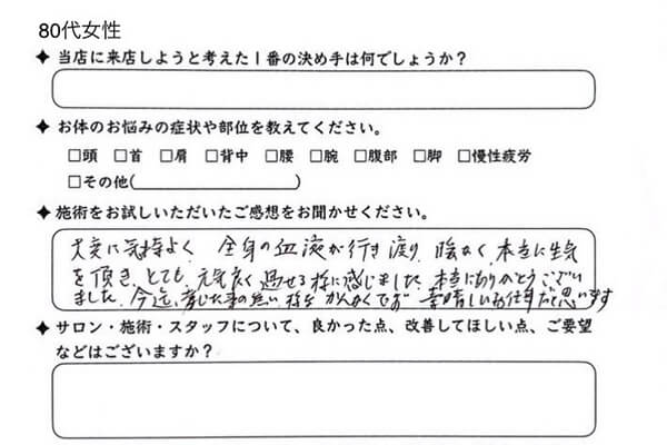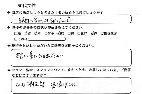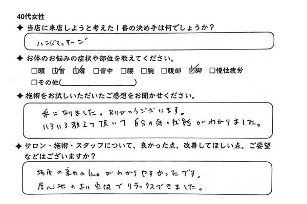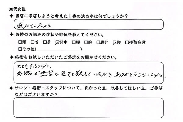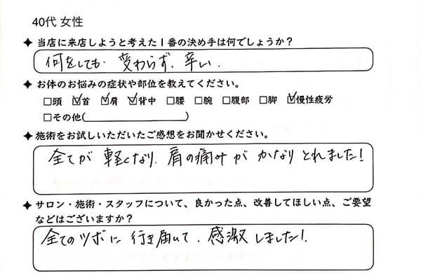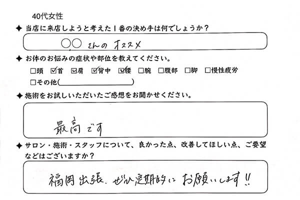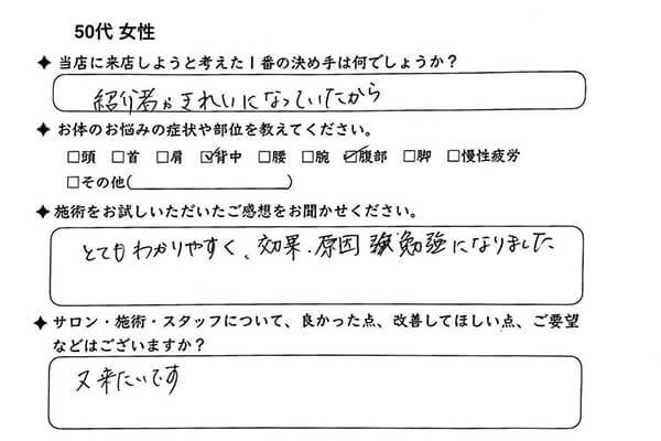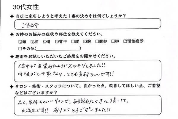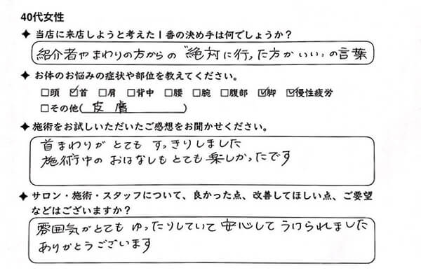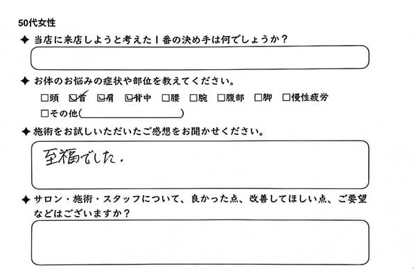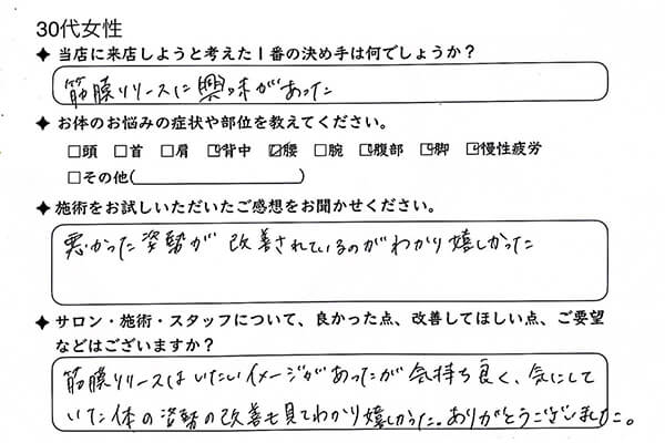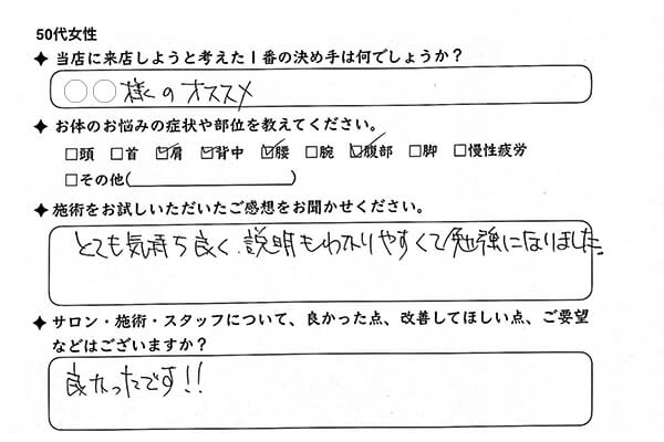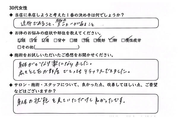 今まで受けたエステ・マッサージの中で一番最高でした。来てすぐの体と施術した後の体のライン、お肉の位置が別人のように変わっていてとても感動しました。