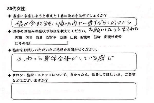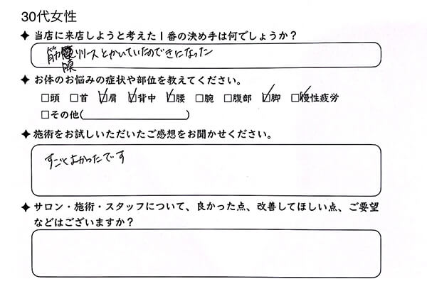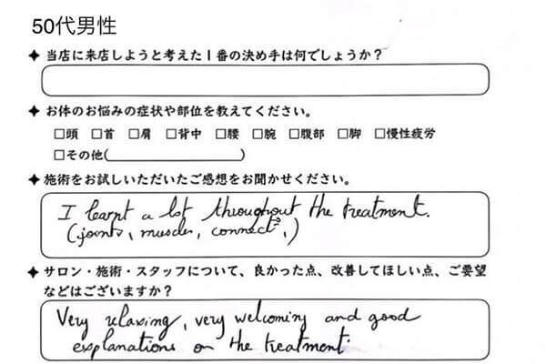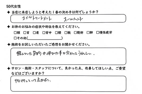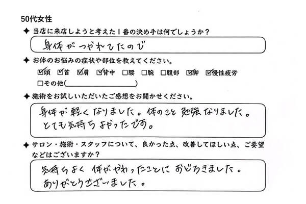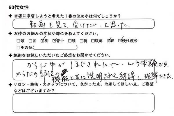 施術後の肩や腕の付け根、足首が軽く動く様になって、これからの自分の体の変化が楽しみです。